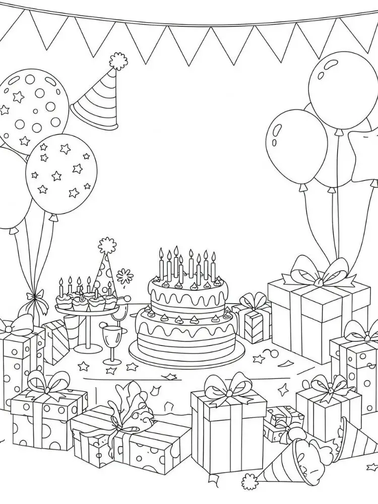 37枚のハッピーバースデーぬり絵:ケーキ、風船、ギフト。