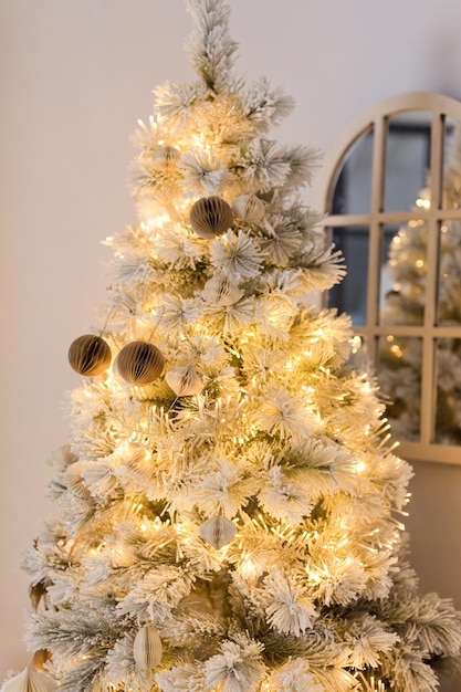 白いクリスマス ツリーからぶら下がっているカラフルなクリスマスの飾り。ホワイトクリスマスツリー.Premium写真。