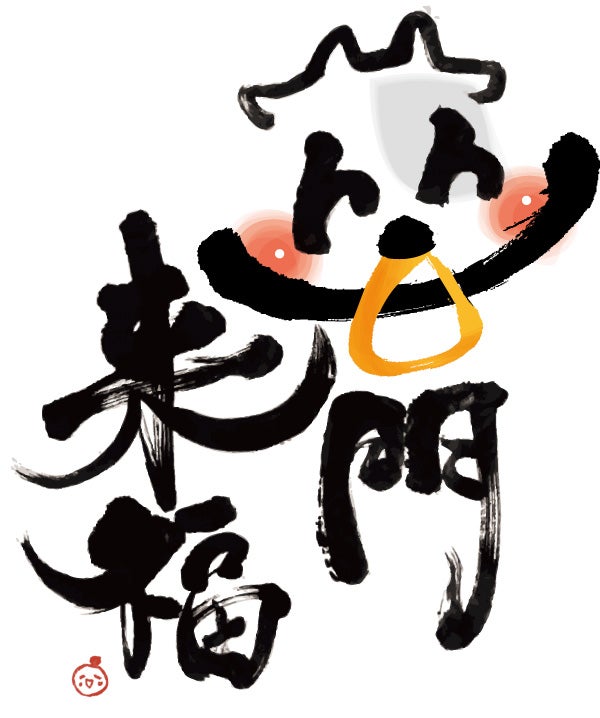 牛の 笑門来福 2021年丑年 年賀状フリー素材原田ゆうかの筆文字。