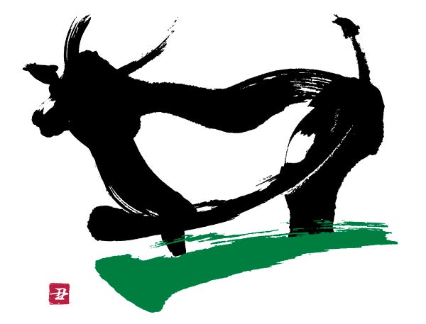 丑年 年賀状テンプレート015 牛、うし、ウシ、書初め、書道、習字、和柄 :イラスト無料。
