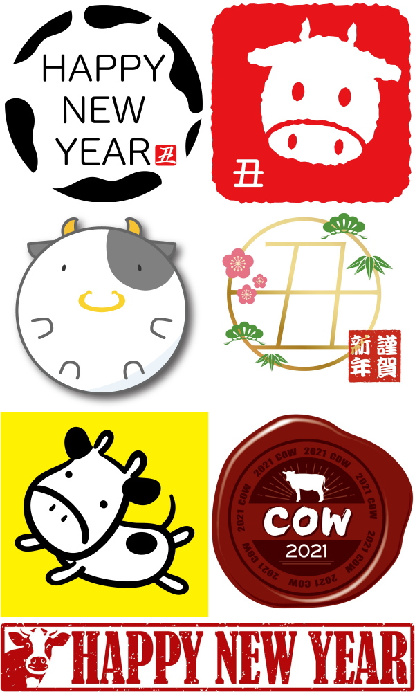 イラスト無料牛のイラスト 丑 干支 年賀状素材セットイラストダウンロード。