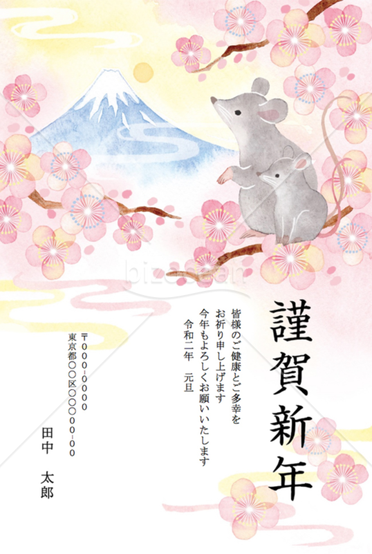2020年 梅の木の上で富士山を望むネズミの和風年賀状bizocean ビズオーシャン。
