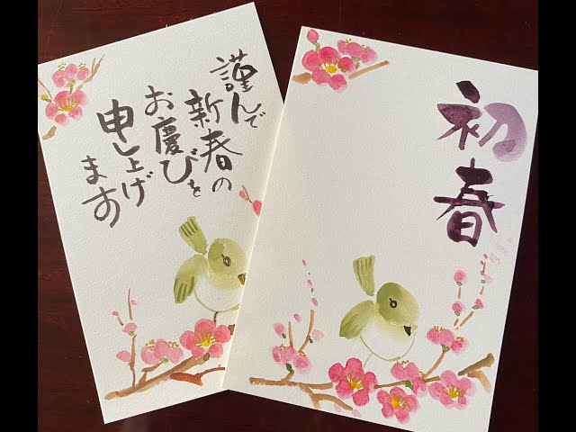 年賀状梅水墨画の描き方japanese ink painting sumi-e plum blossoms冬の絵手紙・ハガキ絵・墨絵・一筆画・和風イラスト・年賀状の花<絵手紙妙華>。