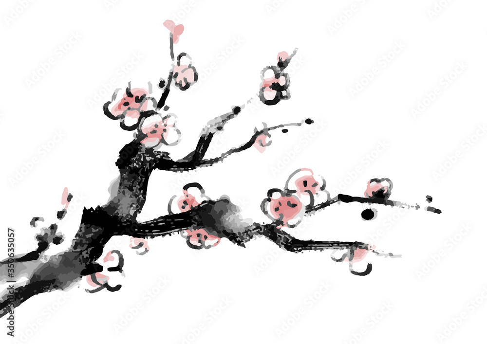Vetor 梅の木の水墨画イラスト カラー年賀状素材 do StockAdobe Stock。