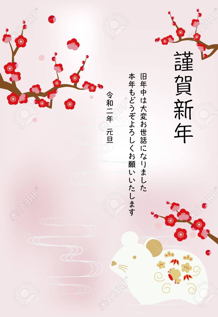 梅の木とマウス人形の年賀状のイラスト。のイラスト素材・ベクター Image 131776587。