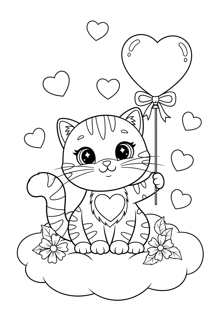 幼児の猫とハートのバレンタインデー ぬりえ - 塗り絵。