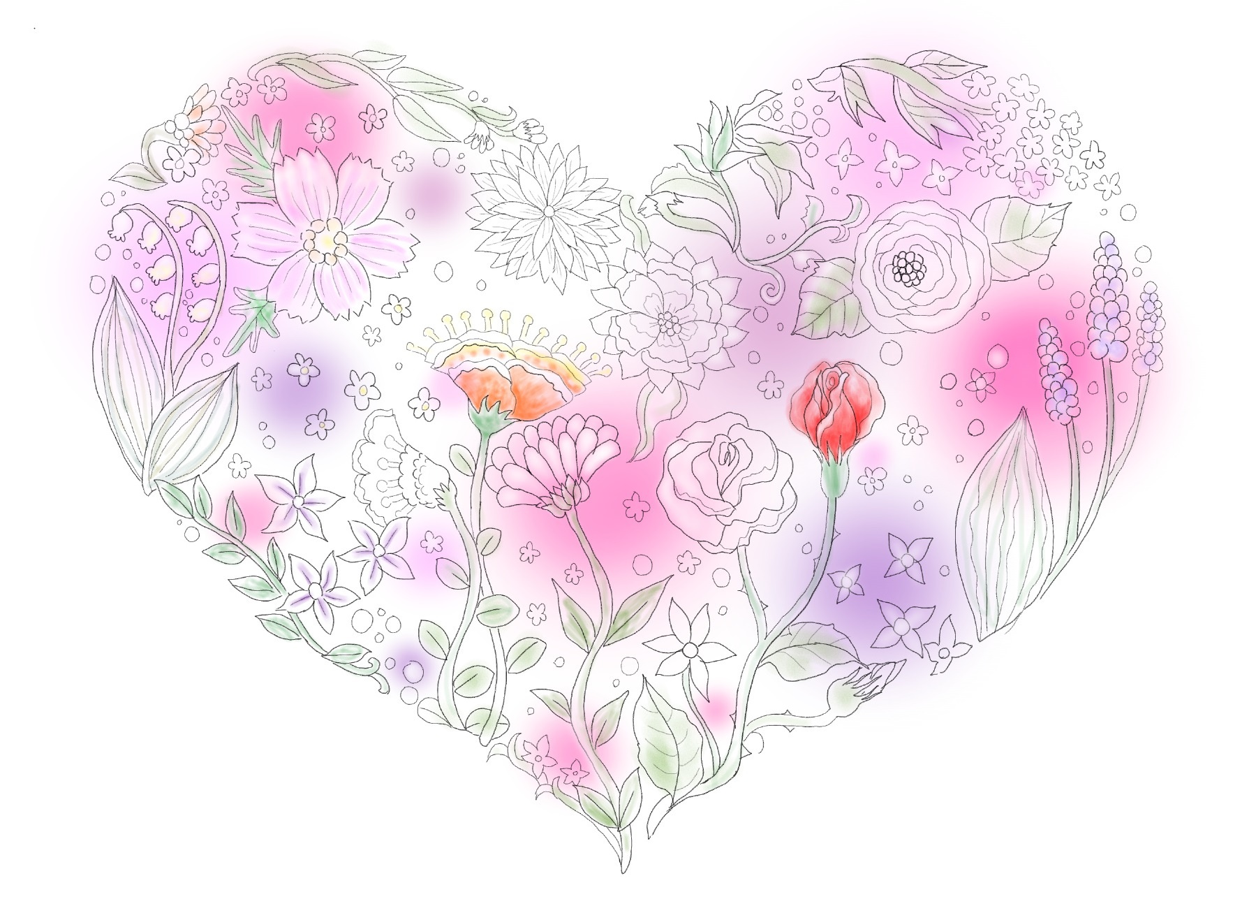 バレンタインデーに贈るハート型の花:ぬり絵ダウンロード 無料。