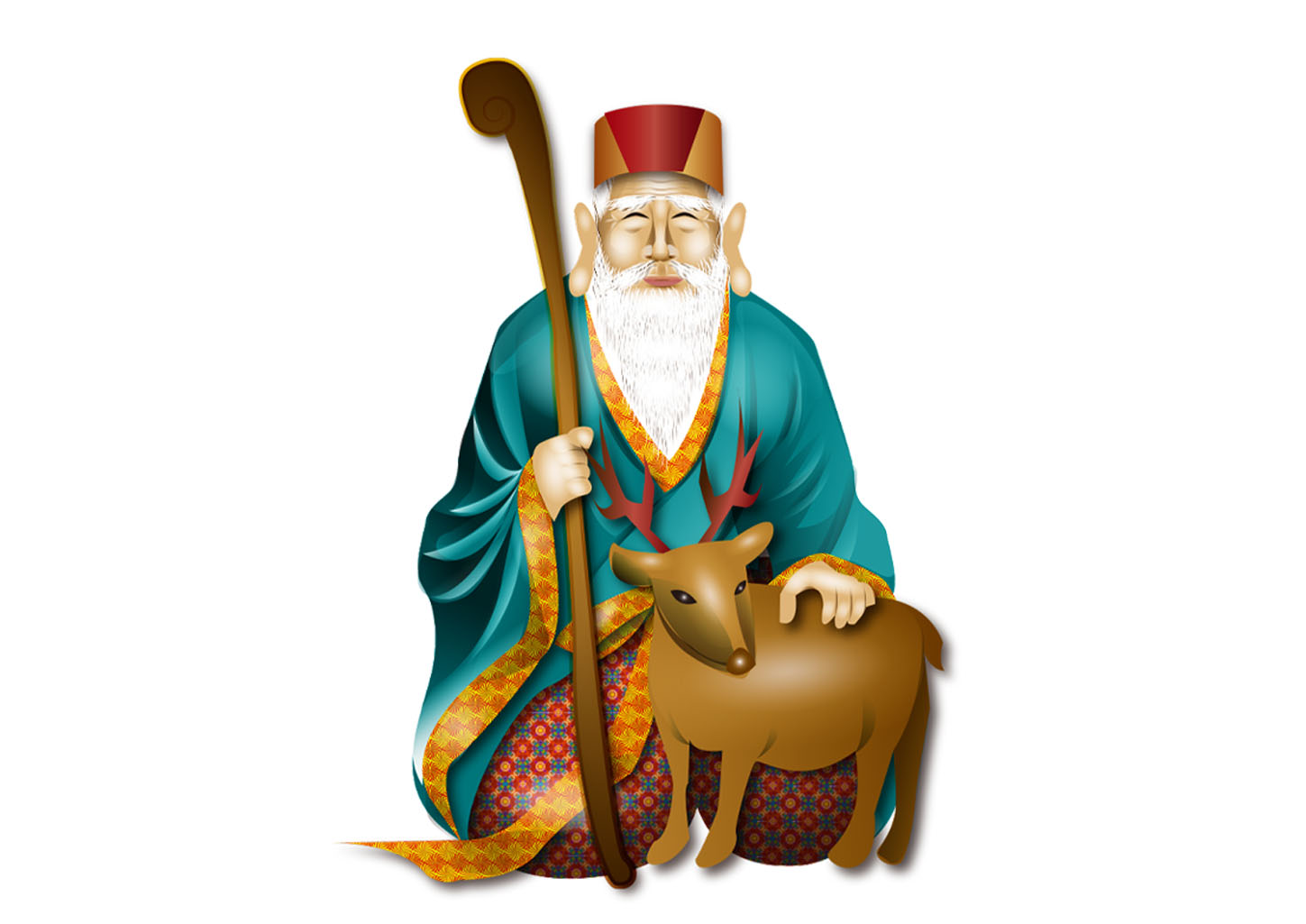 七福神のリアルな寿老人の正月イラスト年賀状2026無料午年の年賀状テンプレートと馬のイラスト年賀状 でざいんばんく。