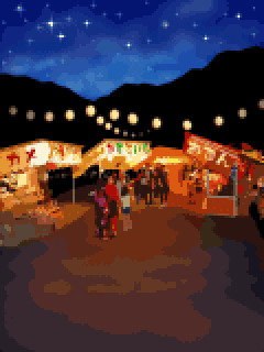 フリー素材 夏祭りの夜と屋台通りのアニメ背景 3枚。