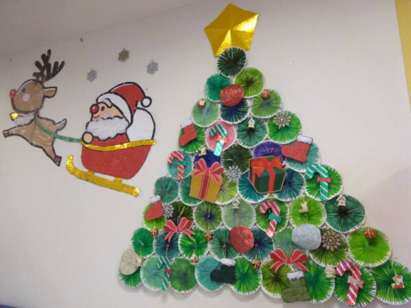 保育園 12月壁面製作 紙皿や折り紙サンタのクリスマスツリー保育士のお仕事静岡。