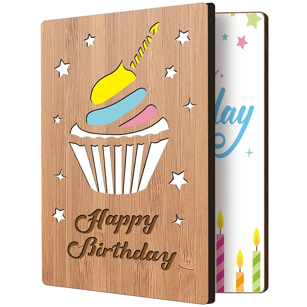 AmazonFINGERINSPIRE ハッピーバースデーカード 本物の竹の木 グリーティングカード 中空ケーキ&星と刻印された言葉デザインハンドメイド 手書きカード 誕生日の願いを送る封筒付きグリーティングカード文房具・オフィス用品。