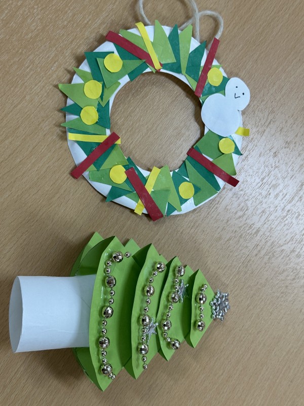 紙皿と紙コップを使って、親子で作れるリースとミニツリー工作つづる。