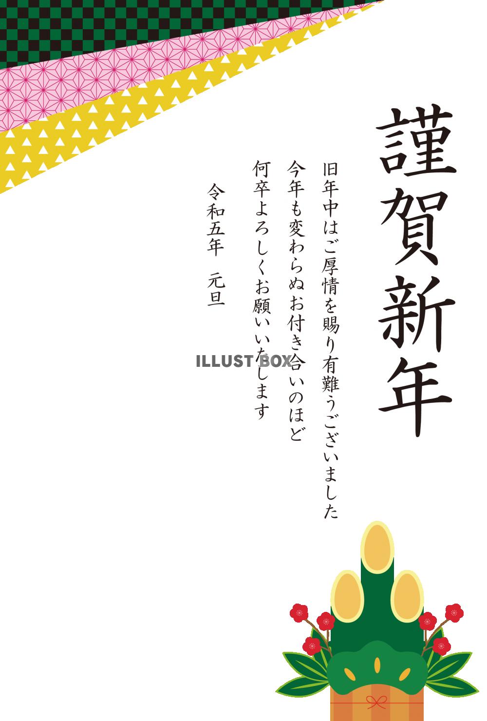 5_2023年年賀状_門松・和柄斜め・謹賀新年・ビジネス用・フォーマル用・和風・例文文例付きテンプレート:イラスト無料。