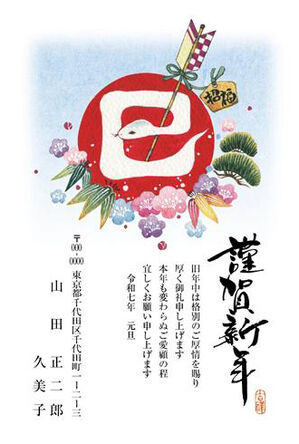 謹賀新年」賀詞・例文入り2025年年賀状テンプレート・企業、個人どちらも使える巳年 へ イラストボックス「プレミアム」テンプレート。