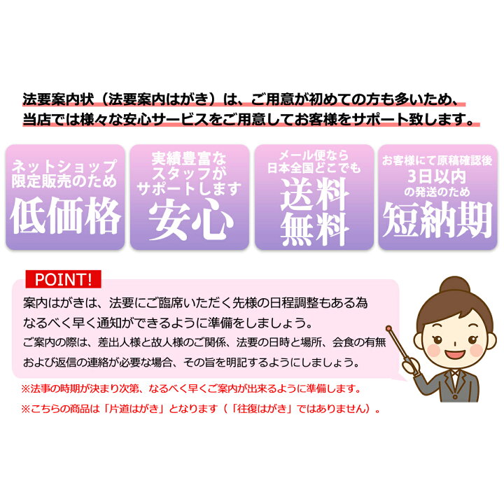 楽天市場 法要 法事 案内 はがき 印刷 用紙 官製郵便ハガキ 往復はがき 5枚~50枚 案内状 通知 連絡 例文 文例 テンプレート 忌明け四十九日 満中陰 一周忌 回忌 挨拶状 名入れ : 帰蝶堂 挨拶状はがき印刷。