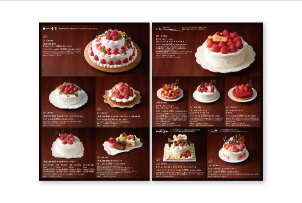 赤色と白色をメイン配色としたクリスマスケーキのパンフレットデザイン株式会社KYO2DESINGブランディング・パッケージ・広告デザイン・WEB神戸・大阪。
