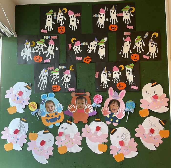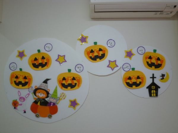 10月11日 金 0歳児 ハロウィン壁面制作栄光保育園。