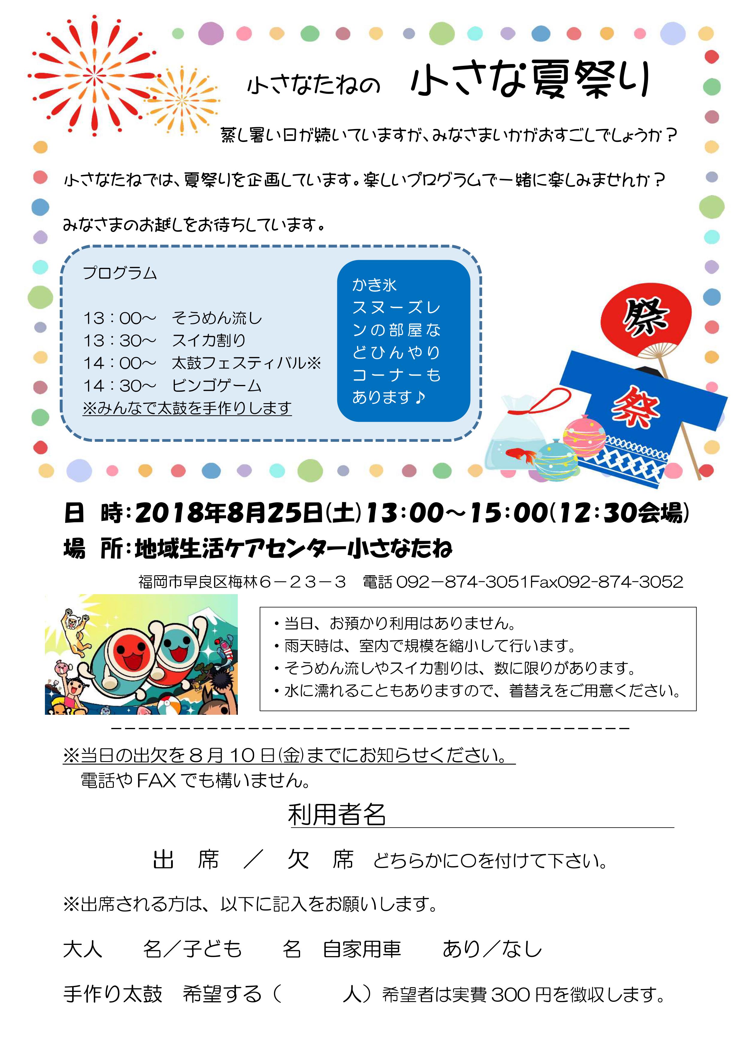 夏祭りのお知らせ - 医療法人社団健貴会 デイサービスまほろば。