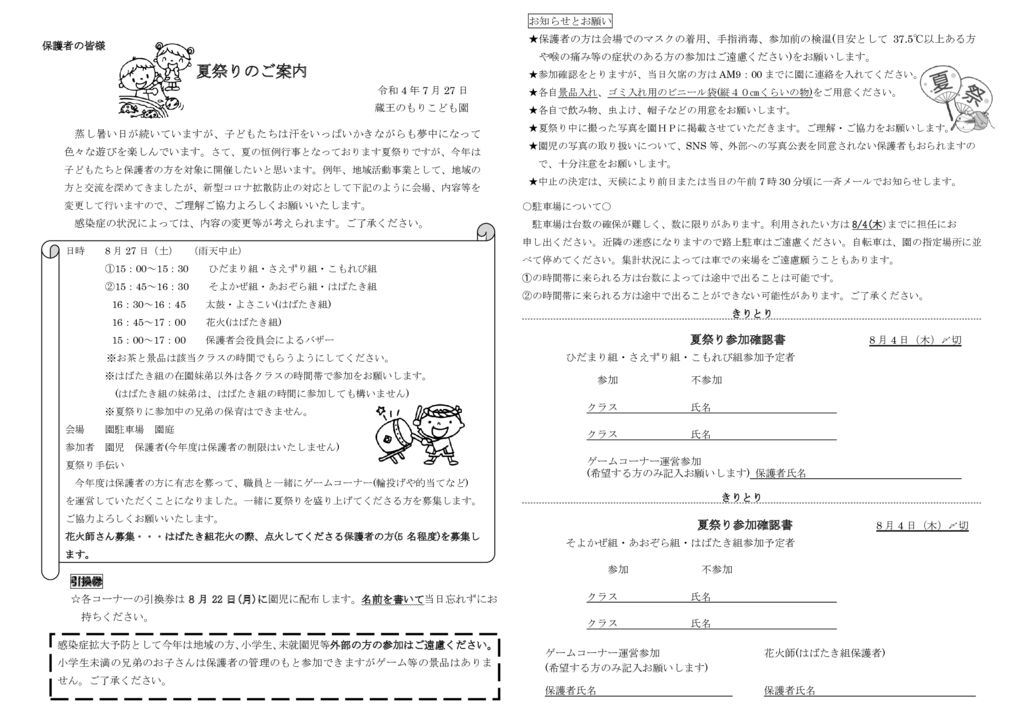 令和4年度夏祭り案内 夕涼み会 2107 – コピー蔵王のもりこども園長岡市の認定こども園です。 恵まれた自然が特徴です。