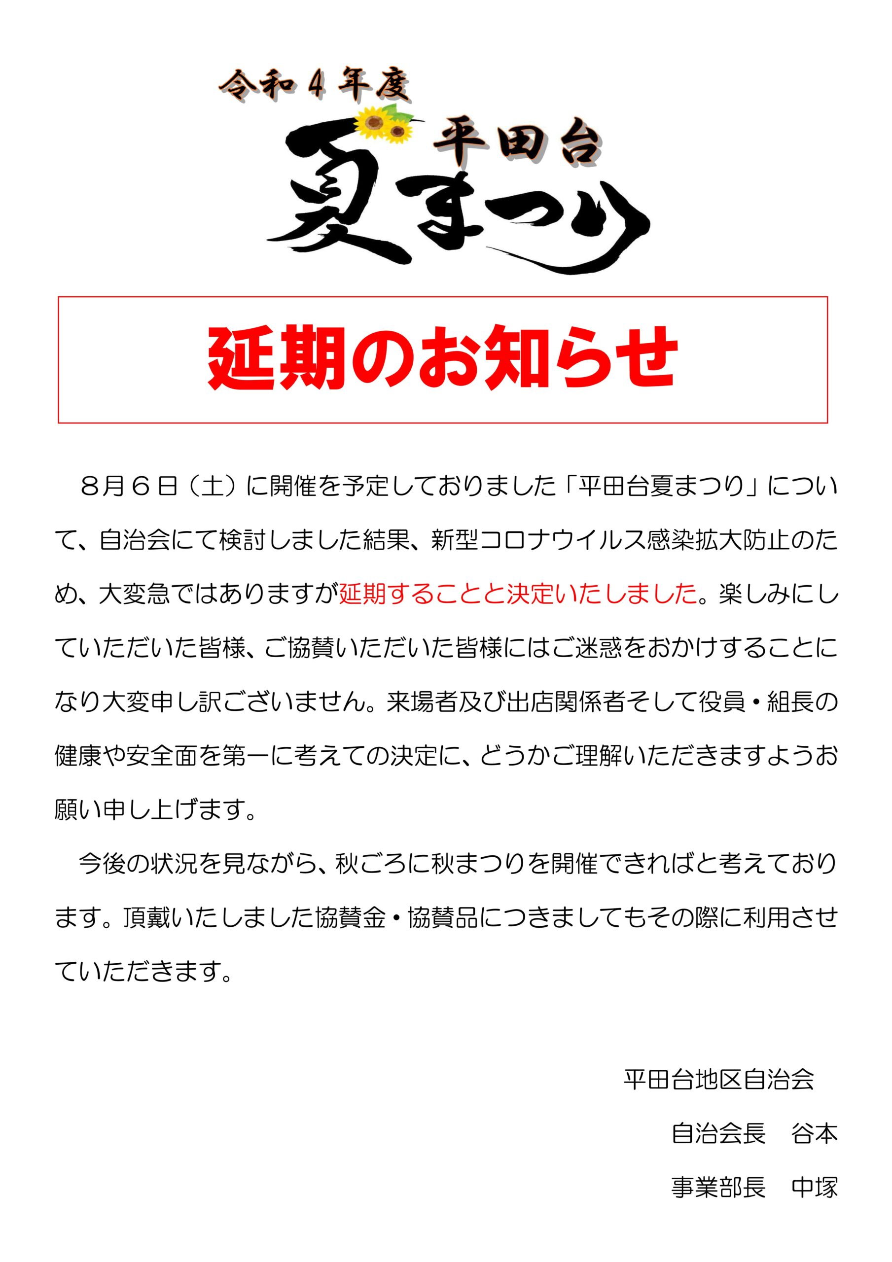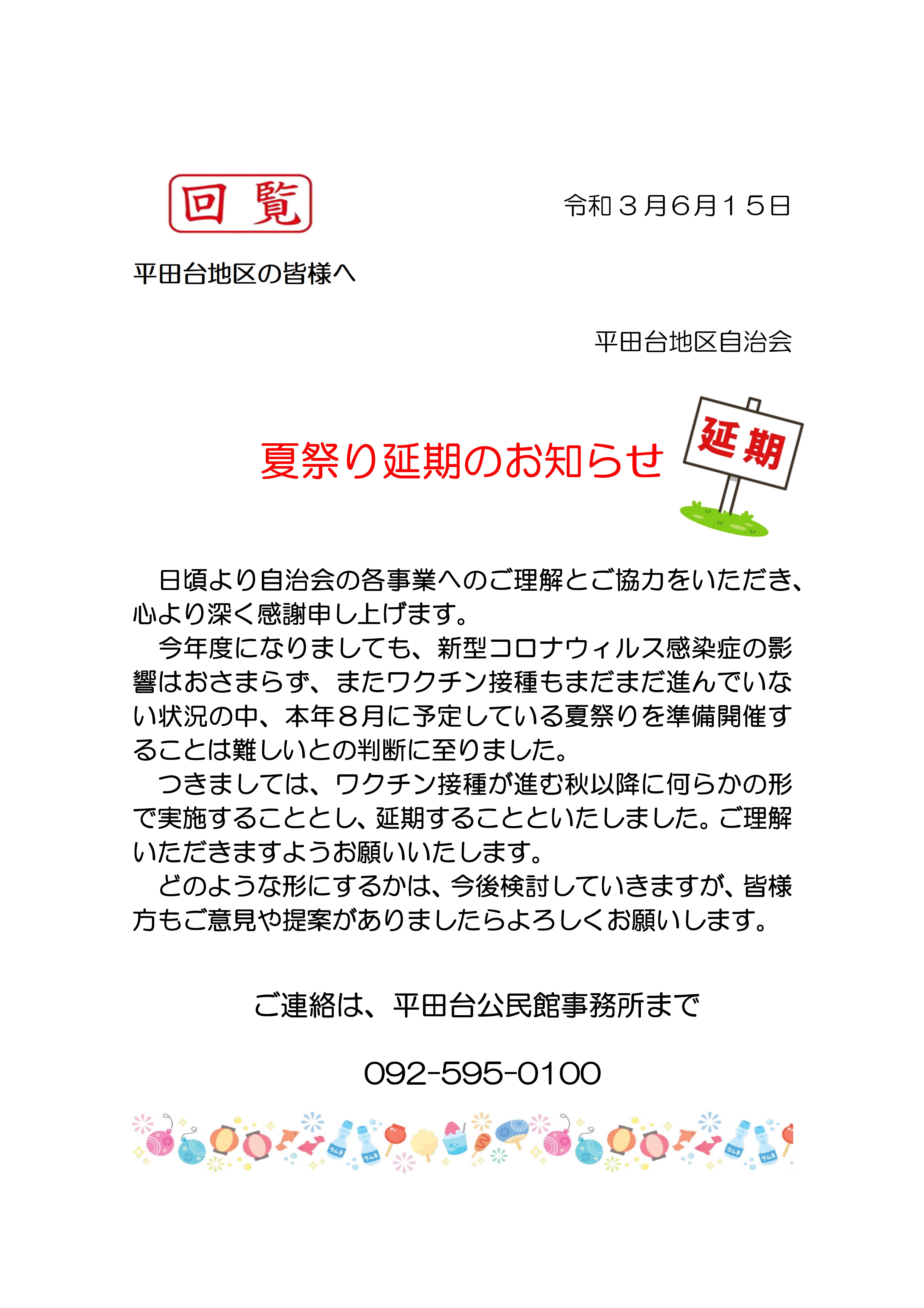 平田台夏まつり延期のお知らせ春日市平田台地区自治会。