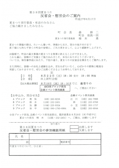 第38回夏祭り反省会・慰労会のご案内 - 田上新町たがみしんまちブログ。