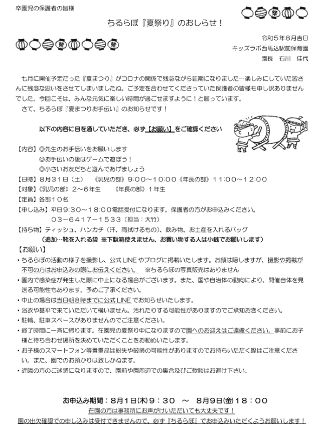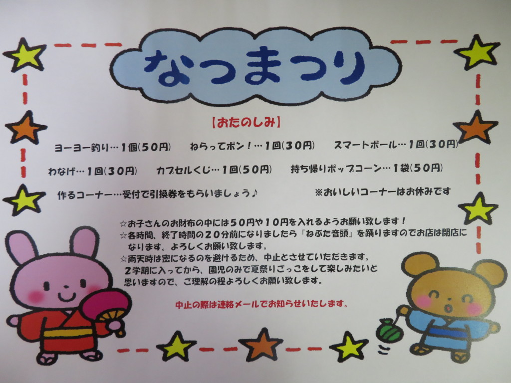 夏祭りのお知らせお知らせ国分寺市西恋ヶ窪の保育園 ポッポのもり保育園。