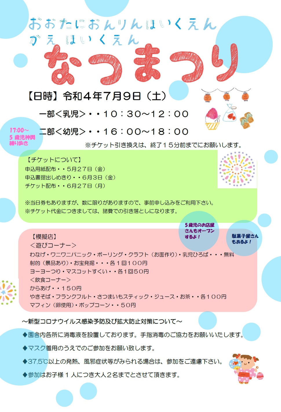 夏祭りご案内・卒園児保護者縁日お手伝い募集のお知らせ:鈴蘭保育園社会福祉法人 大谷菩提樹会 北海道音更町・帯広市。