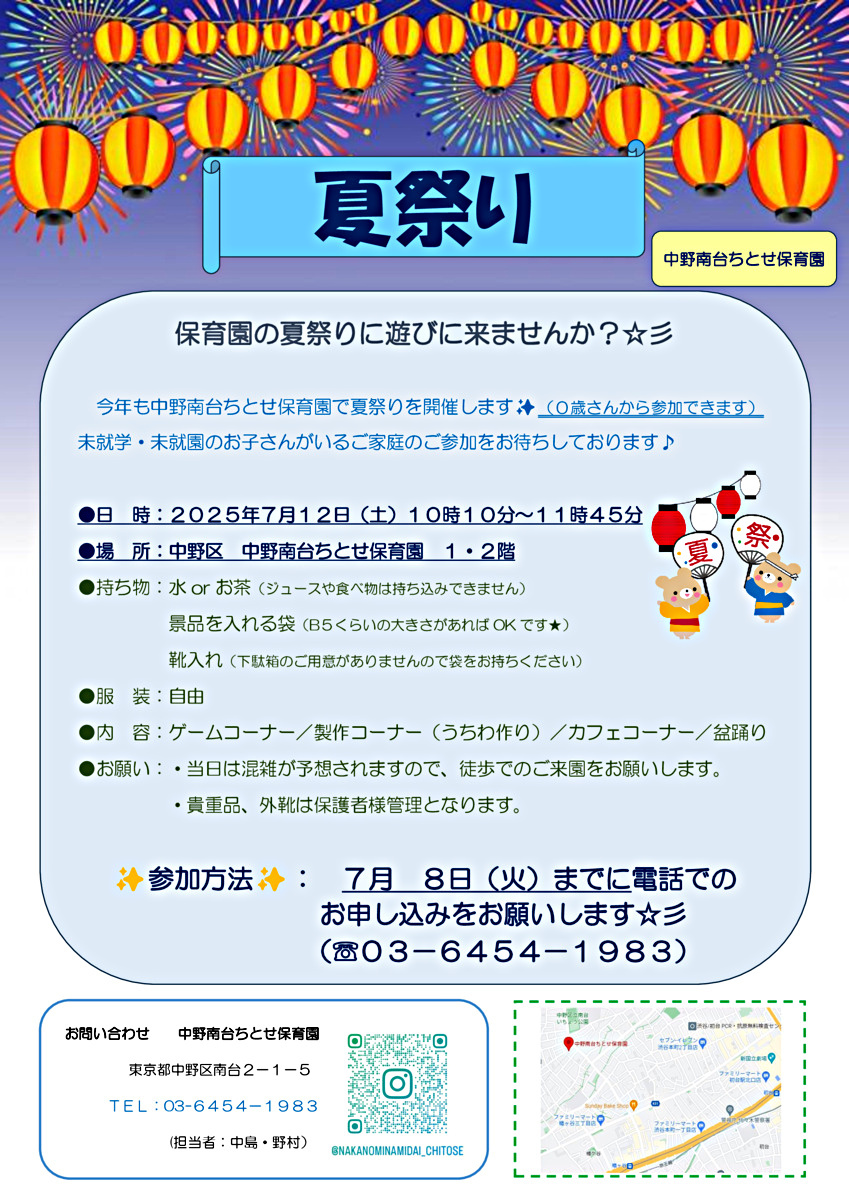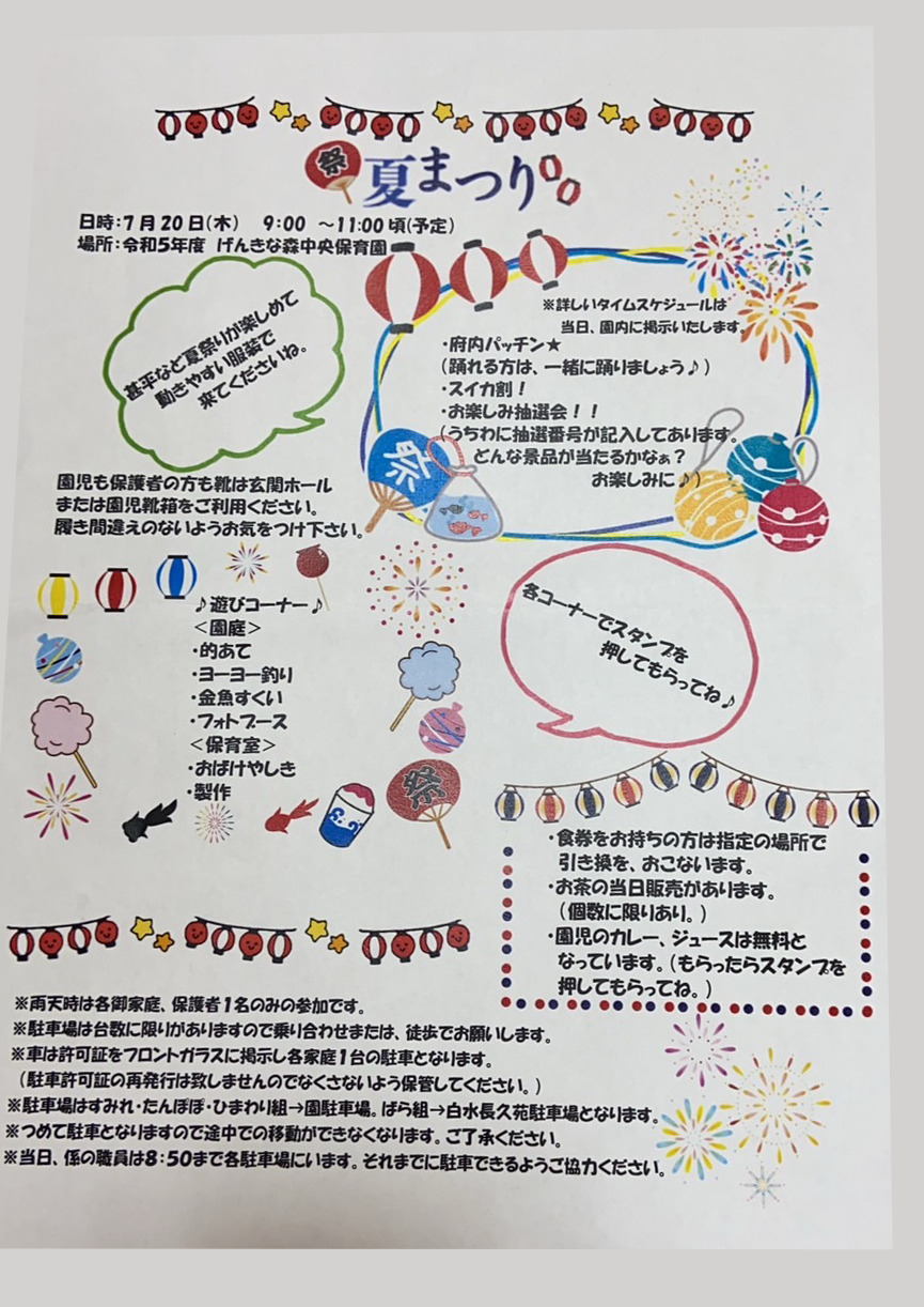 夏祭りのご案内 - げんきな森中央保育園大分市にある自然豊かな保育園です。