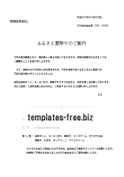 連合町内会盆踊りについての文例テンプレート Word・ワード使いやすい無料の書式雛形テンプレート。