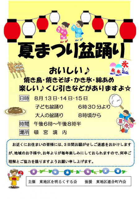 夏祭り盆踊り大会開催のお知らせ 8月19日 土。