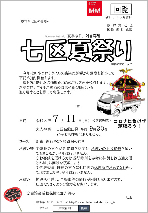 七区夏祭り開催のお知らせ 令和3年7月11日- 原市地区第七区。