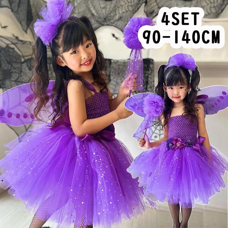 ハロウィン 衣装 子供 蝶の魔女 お姫様 紫 ショートドレス 妖精 女の子 コスプレ 仮装 コスチューム 4点セットキッズファッションsweetsweet。