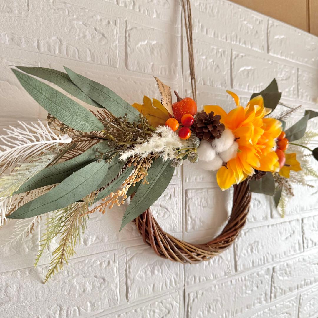 ハロウィンリース 秋 三日月型リース ハーフリース 光触媒加工 大人シックなハロウィンリース ハロウィン リース 手作りキット 造花 かぼちゃブラウン -アトリエブルージュ・flower shop - プレゼント&ギフトのギフトモール。