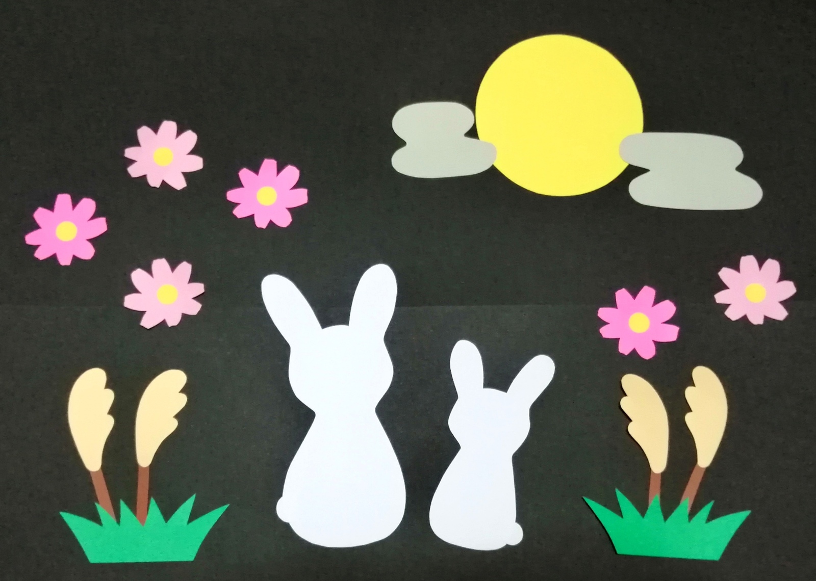 色画用紙で作る季節の壁面飾り-9月「十五夜-うさぎと月見団子」。