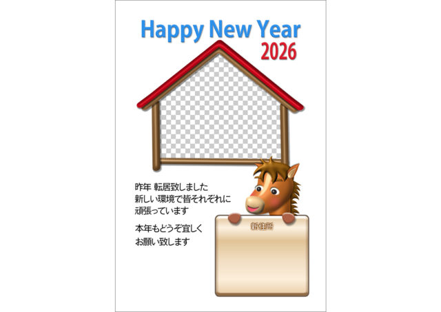 引越し報告年賀状テンプレートと文例・マナー年賀状2026無料午年の年賀状テンプレートと馬のイラスト年賀状 でざいんばんく。
