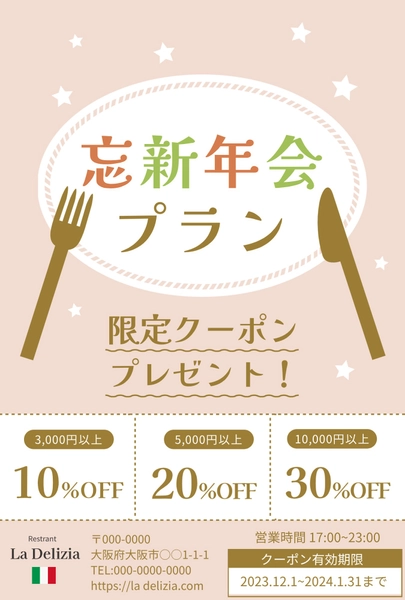 忘年会・新年会宴会コースの無料テンプレートチラシ大毎上町オリコミ 大阪の新聞折込チラシ広告ならお任せ。
