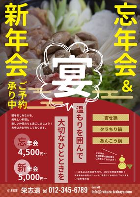 無料チラシテンプレート - 忘年会向けの和風チラシデザインASOBOAD。