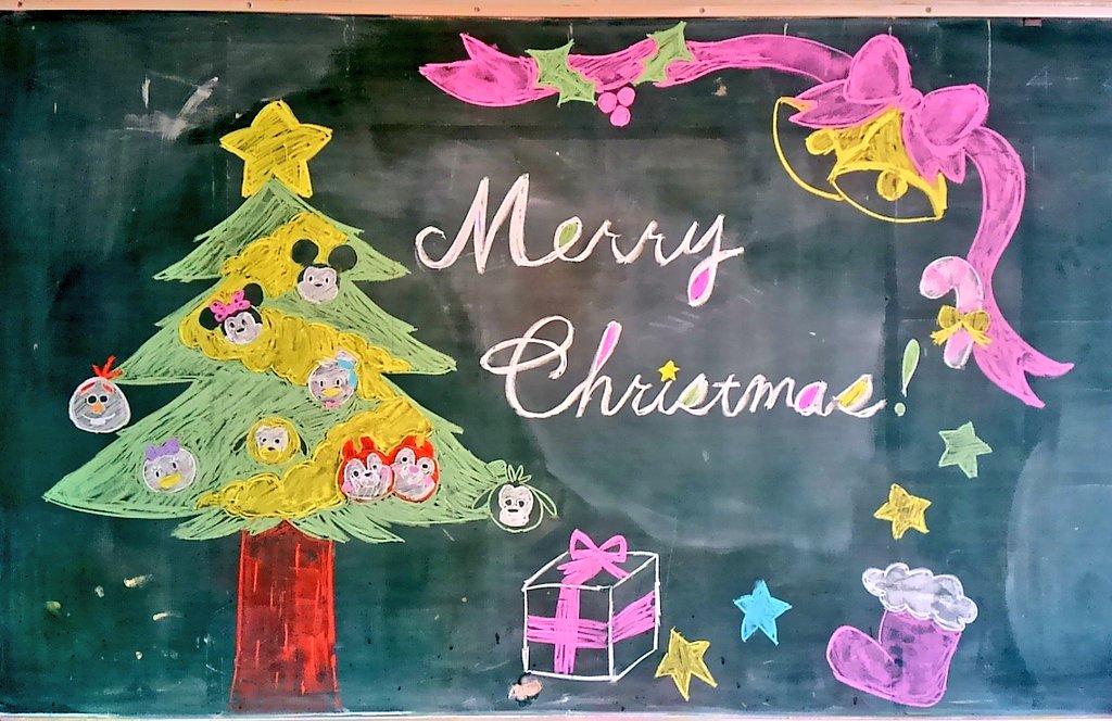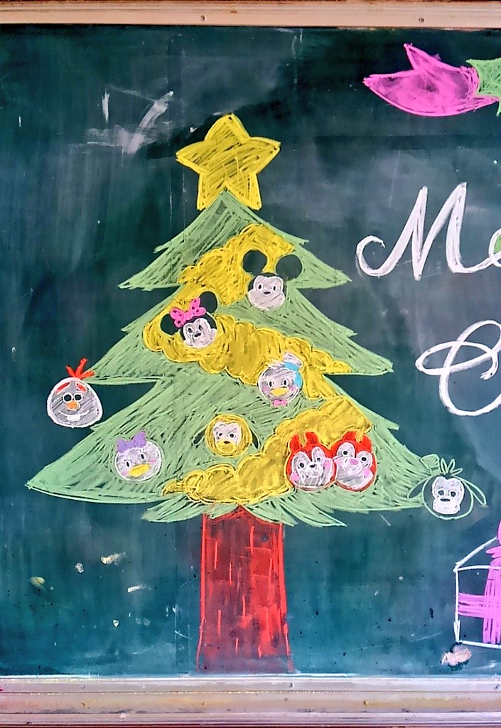 ゆきえ@yukiev411 : "今月の黒板アート🎅クリスマスツリー🎄 今時の小学生にはディズニーツムツムが人気らしいよ! みんな "。
