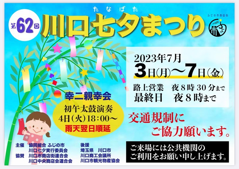 川口七夕まつり第64回ふじの市商店街 お知らせ📢 第64回 川口七夕まつり 開催します🙋♀️2025年7月3日木曜日〜7日月曜日 最終日20時までご来場の際は ✓熱中症対策を ✓混雑を避けて ✓交通機関をご利用いただき ✓ゴミ捨てのご協力✓譲り合いの気持ちをもって。