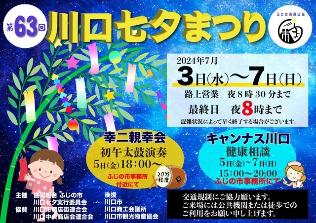 第63回川口七夕まつり今年もこの季節がやってきました。 7月3日 水 ~7月7日 日 にかけて、『第63回川口七夕まつり』が開催されます!川口七夕まつりはふじの市商店街で年に一度開催される一大イベントです! 開催中はきれいな七夕飾りが飾り付けられるほか、多数の。