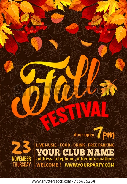 秋祭りのチラシまたはポスターテンプレート。暗い背景に明るい秋の葉とラインアートの葉のパターン。書道の碑文秋の祭りとテキストのスペース。ベクターイラスト。」のベクター画像素材 ロイヤリティフリー735656254Shutterstock。