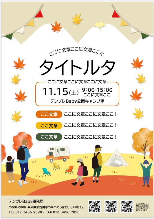 秋、キャンプ、アウトドア、イベント、A3ポスター&チラシ、Word60771Wordの印刷物・チラシ無料テンプレートなら「テンプレBaby」。