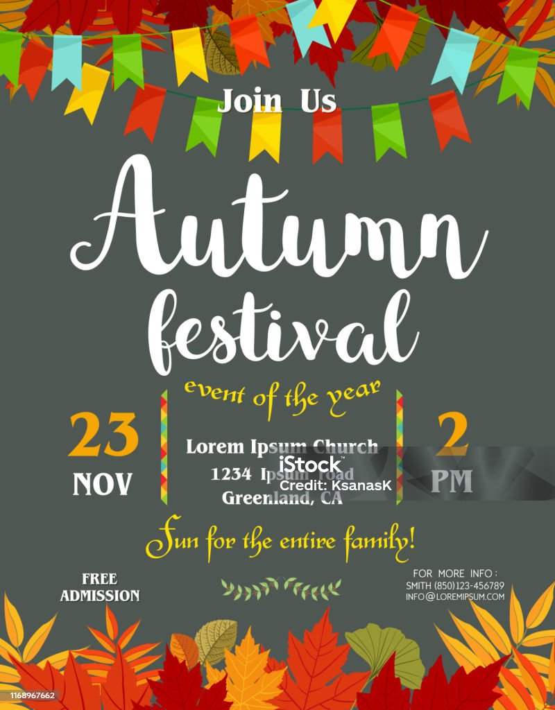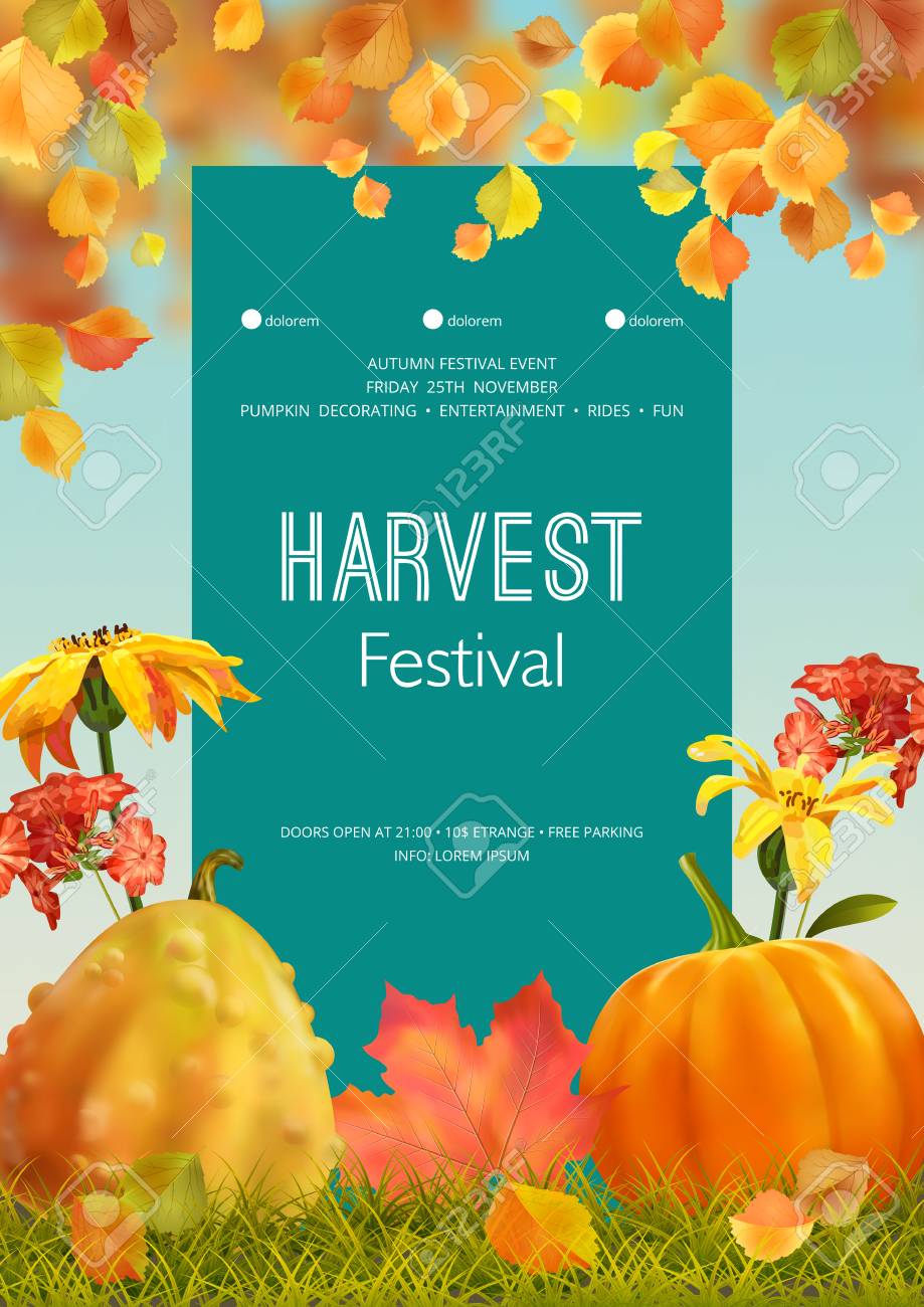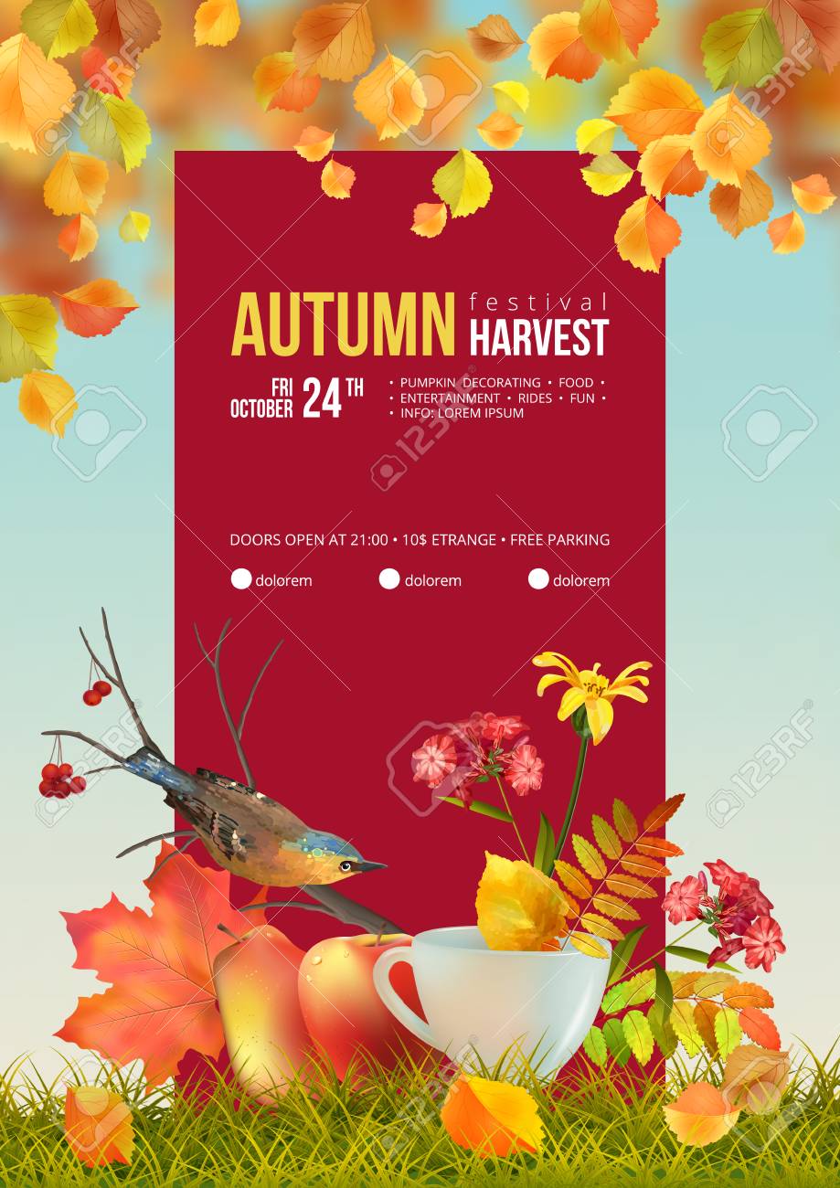 秋祭りのチラシやポスターテンプレート 招待または秋のシーズンホリデーのお祝いポスターのためのデザイン ストックベクター ©kupritz291753580。