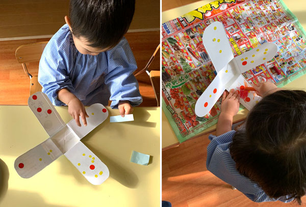 今月の手作りおもちゃ〜紙皿のこま〜 1月、お正月には『こまを回して遊びましょ〜』と歌われている、こまを紙皿で作ります! こま が回ることでお金が回る、物事が上手く回るなど縁起の良い遊びとして知られています。 すでに作ってくれたこまは、回す前と後では見え方が。