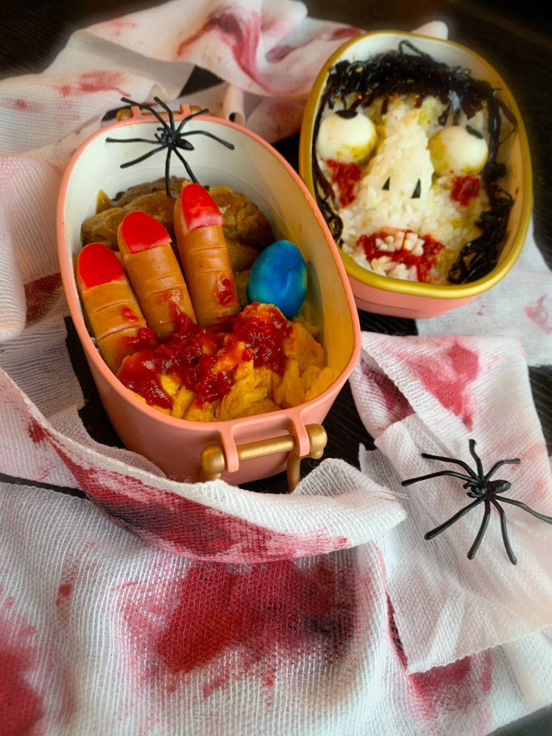 ハロウィン的キモめし弁当たくさん集めました🎃誰にも頼まれてないけどw,もうお弁当作らなくなっちゃってつまんないなー🍱誰かハロウィン弁当持ってかないかなぁー。→いらんわ🤣, Halloween creepy lunchbox photos👻,ハロウィン弁当,ハロウィン研究家,五条まあさっちん,キモめし,ハロウィンランチ ,ハロウィンキャラ弁,ホラー弁当,。