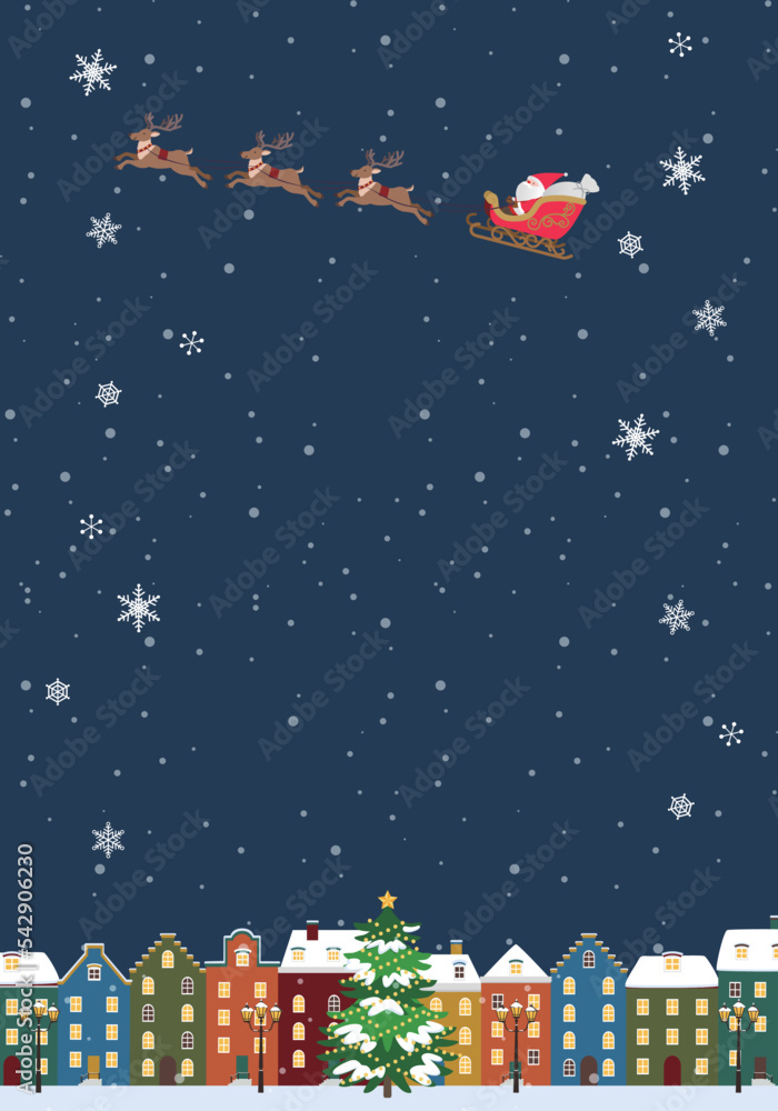 クリスマスイブの夜の街並み背景フレーム縦 サンタとトナカイ:イラスト無料。