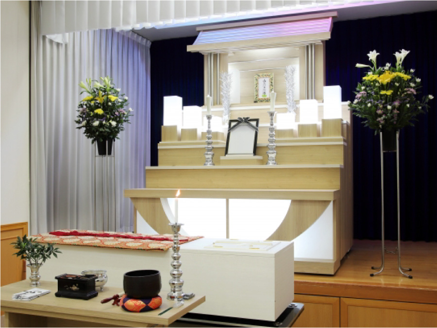 祭壇は2種類あって、白木の祭壇とお花で作った生花祭壇メモリアルホール紫蘭。