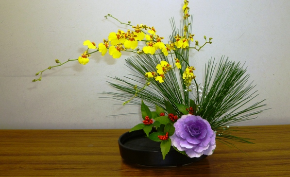 生活の中に花を岐阜県多治見市池坊いけばな稽古日記 生け花教室・華道教室 :盛花 正月花竹、菊、葉牡丹。
