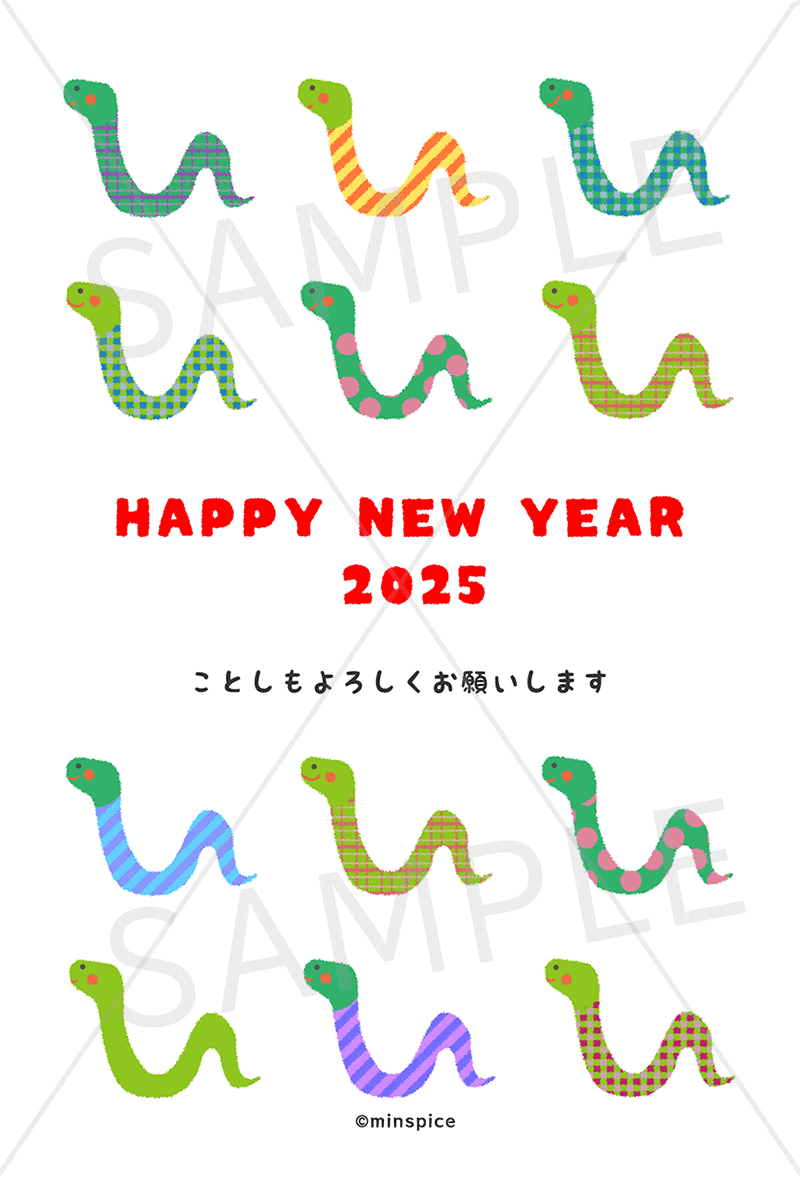 2025年巳年年賀状テンプレート無料ダウンロードできます。子供から大人まで使える2025年巳年・へび年年賀状 絵入り 期間限定でダウンロードできます子供向けイラストレーターminspice。かわいい子どもイラスト、幼児イラストから家族向けイラストまで。保育、児童書。