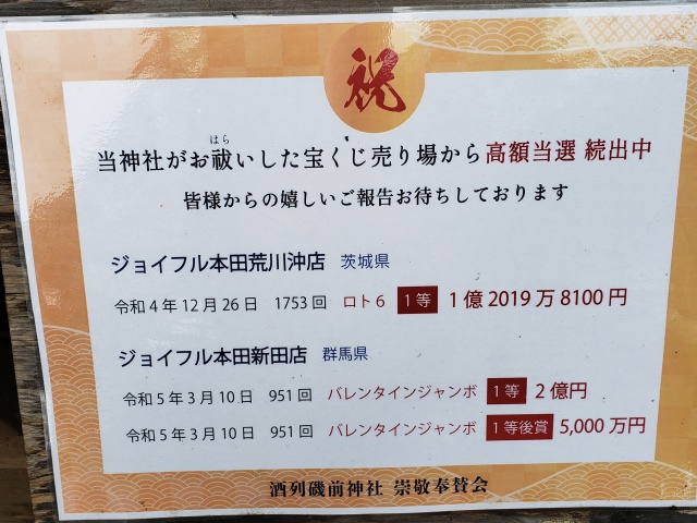 酒列磯前神社 on X: " 宝くじ高額当選祈願祭日時:令和5年11月21日 9時30分〜 場所:ジョイフル本田チャンスセンター宝くじ売り場 祭祀: 宝くじ高額当選祈願 神職・巫女が売り場にておまつりを執り行います。 🟡宝くじ購入の列にお並びいただいている一般の方もご一緒。